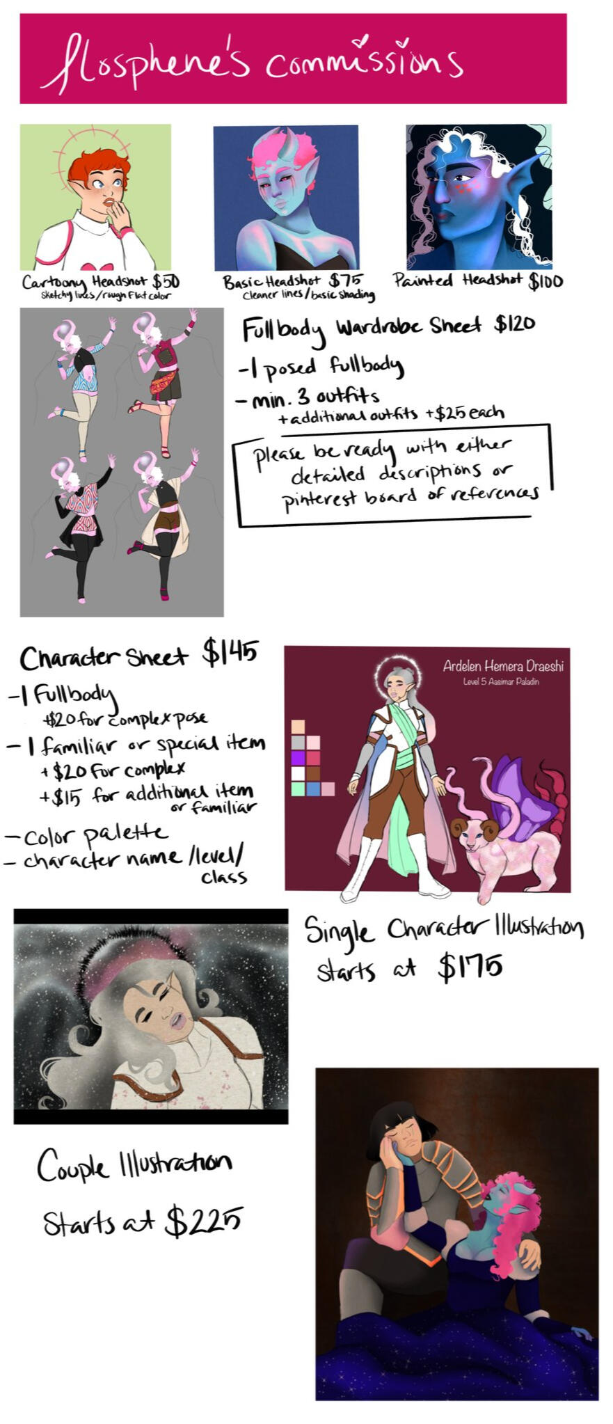 *Please be prepared with detailed description of styles/outfits or a pinterest board with inspiration.Character Sheet $145